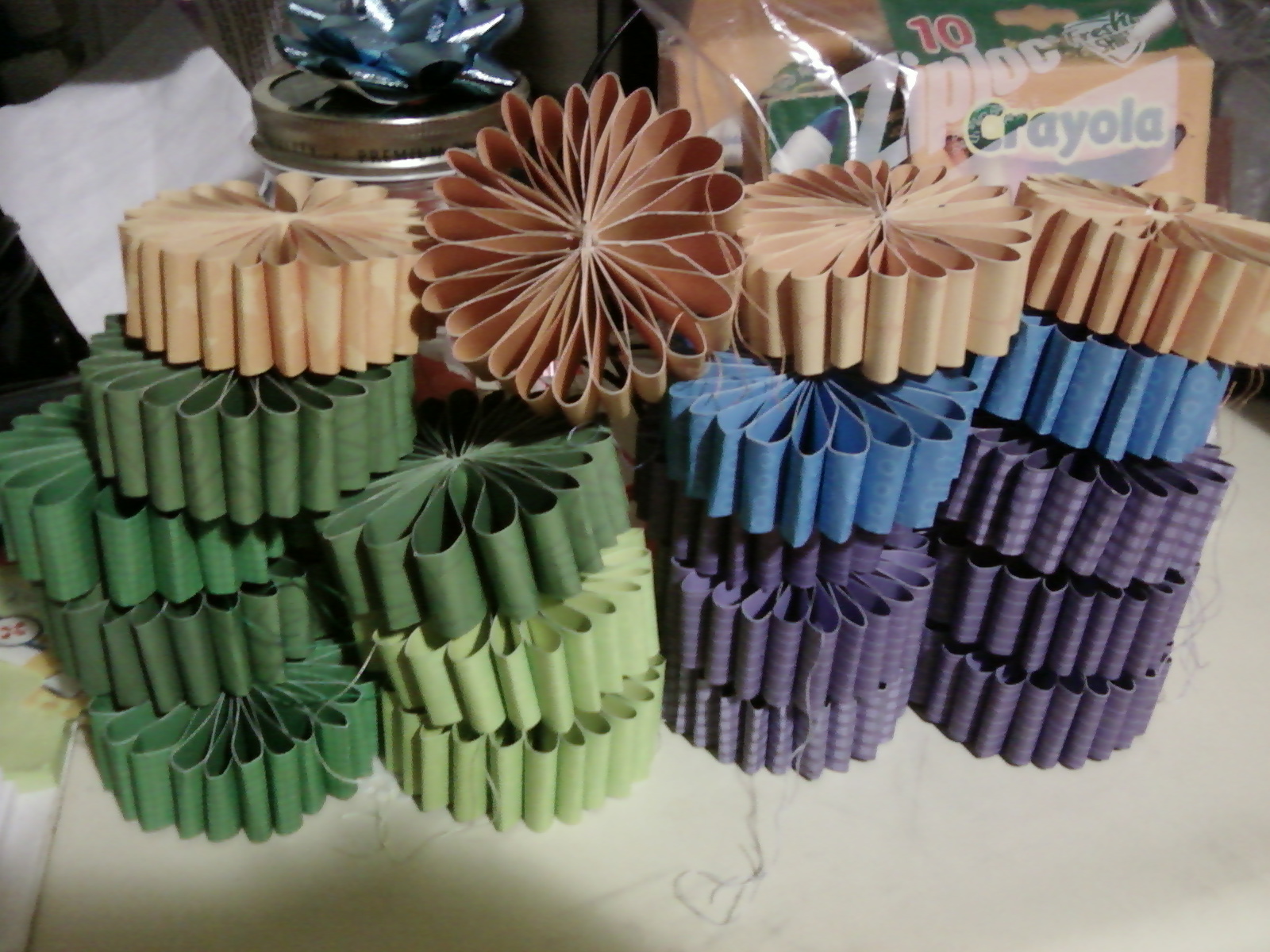 I used scrapbook paper to make them and it was a little stiffer than computer paper but it worked out. I spent like all day Monday making them. We just watched TV and I used double stick tape to make the ornaments. I could make more!
